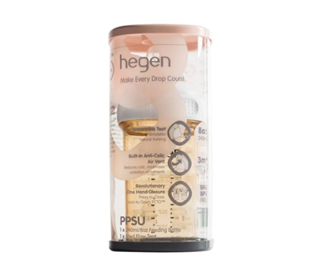 Hegen’s 240ml/8oz Feeding Bottle is an ideal size to meet the growing appetite of babies. It comes with a Medium Flow teat that is suitable from the third month as the teat hole becomes bigger and gradually increases milk flow rate. The larger storage capacity also caters to a mother’s established milk flow and increased volume.