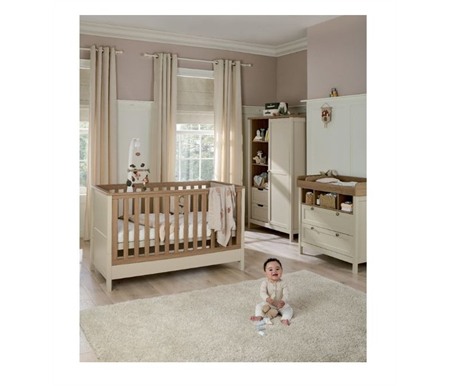 With a distinct two-tone wood-effect and soft cashmere shade, that looks great in any nursery bedroom. Designed to see you from birth until around 4 years old, the Harwell Cotbed converts easily from cot to a toddler bed. With 2 easily adjustable cot base heights, you can pop baby down for a nap without disturbing them, and as they get older and become more mobile, simply lower the height to keep them safely inside their cot. Fixed wooden side panels ensure your little one is kept secure. Simply remove the sides when your little one is ready to convert into a toddler bed. And because Mamas & Papas' cotbeds have been tested to the strictest Australian safety standards, you can sleep easier knowing your little one is safe.