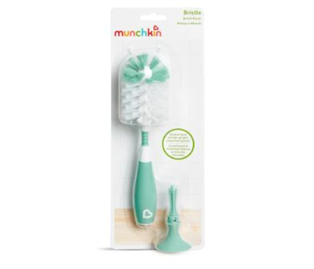A LITTLE FLEX GOES A LONG WAY! Keeping baby bottles clean is essential for baby’s health. But let’s face it, germs love kitchens and bottle washing is a part of (kitchen) life. Now there’s a smart way to keep your trusty bottle cleaner safe from household germs. The Munchkin Bristle™ Bottle Brush features a patented suction cup base, so when scrubbing is done, you simply pop it onto the countertop to keep it upright, fast-drying and away from germs. The non-slip handle gives soapy hands a firm grip and the sturdy nylon bristles are tough on dirt, yet gentle on baby’s bottles. Since nobody has time for flinging soapy water around the kitchen, we even developed our bristles to reduce the dreaded splash-back when it pops out of the bottle opening. We know baby bottles come in all shapes and sizes so we added a new flexing neck to help get into every bottle with ease. Just when you thought we couldn’t cram in any more features into such a small package there’s even a convenient soft rubber nipple brush inside the handle, making this brush equally suited for cleaning pump parts, valves, and other small bottle accessories, too. The Bristle™ Bottle Brush keeps your bottle cleaning routine sanitary and your sanity intact, so you only need to worry about the bottle parts, pots and pans you can see, not the dirty stuff you can’t.
